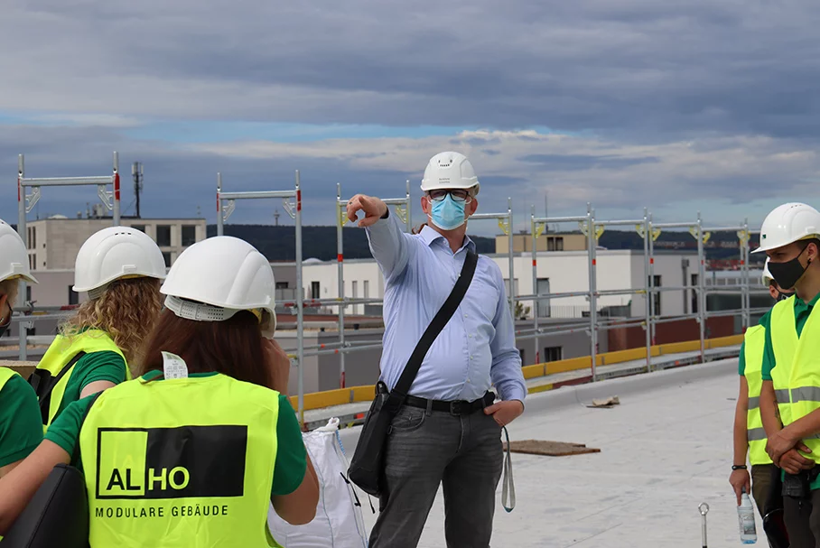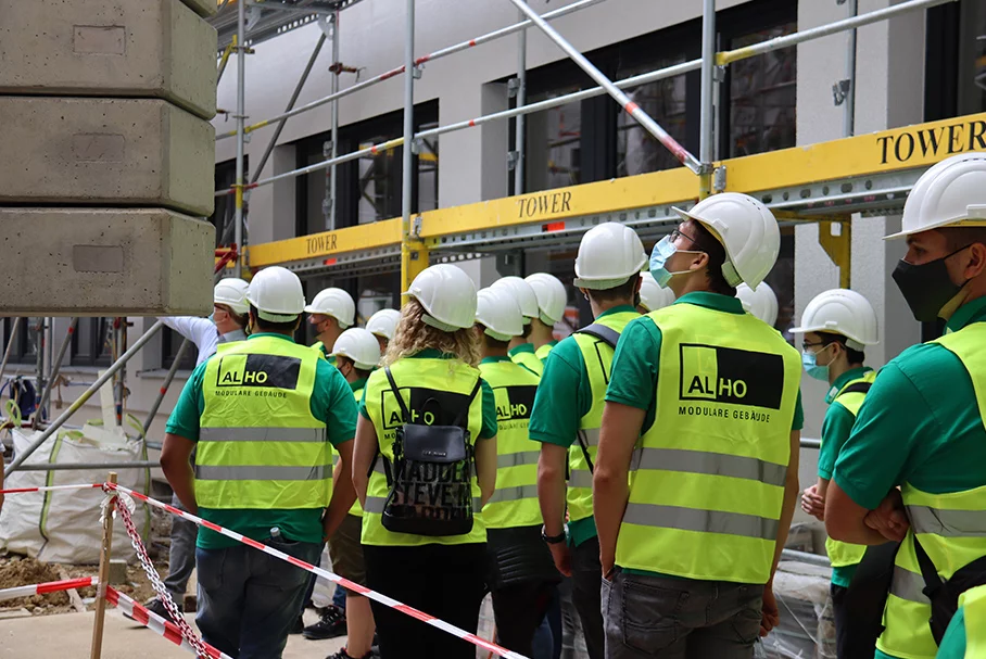 Zunächst ging es mit dem Bus nach Aachen zur Baustellenbesichtigung des Bürogebäudes für die Landmarken AG. Vor Ort staunten die Auszubildenden nicht schlecht über das in ALHO Modulbauweise gebaute Gebäude. Wie aus vielen einzelnen Modulen ein so großes Gebäude entsteht, durften sich die Azubis nun einmal anschauen.