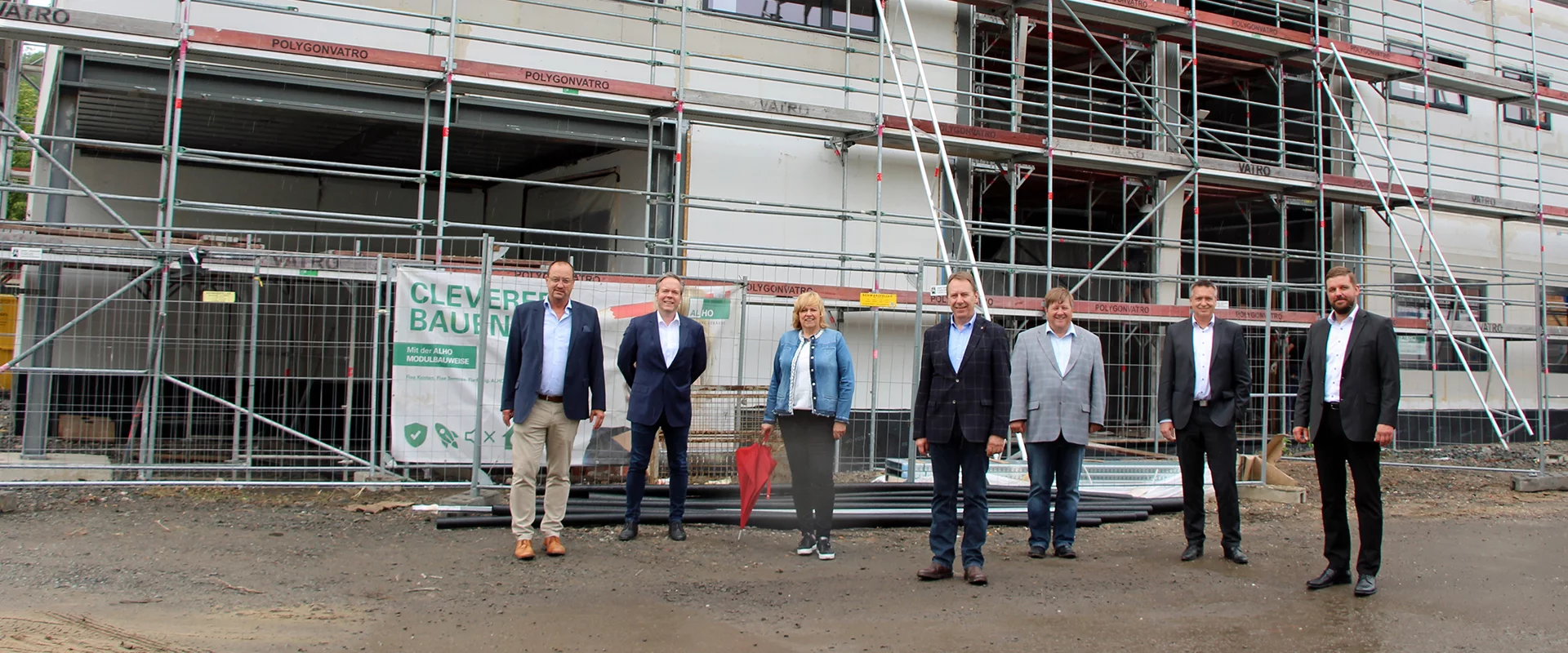 Drei Wochen nach Montagebeginn der Raummodule für die Erweiterung der Akademie Gesundheitswirtschaft und Senioren (AGewiS) auf dem Steinmüllergelände in Gummersbach steht der veredelte Rohbau.