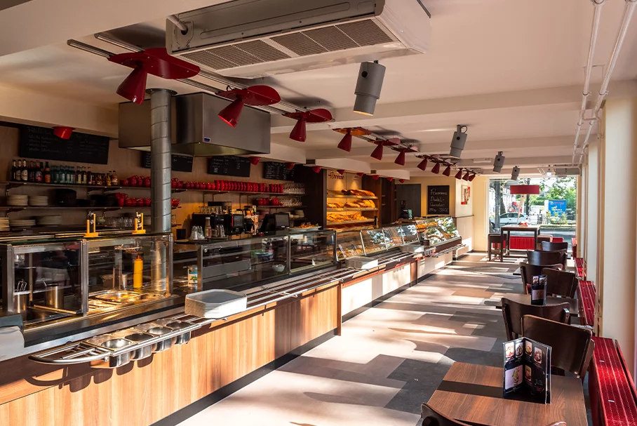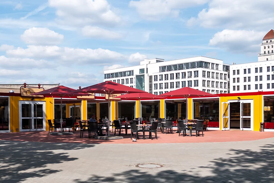 Nur sechs Wochen hat es gedauert und die Bäckerei Fehrmann konnte im Mai 2019 in dem neu errichteten Dresdner Bäcker-Café ihre Kunden begrüßen. Schon von weitem ist das eingeschossige neue Gebäude, das sich aus insgesamt 21 Containern der Baureihe ProBasic zusammensetzt in den Firmenfarben gelb und rot als typisches Fehrmann-Café zu erkennen. Im schmalen Schenkel des L-förmigen Grundrisses sind der Verkaufsraum mit Tresen und eine Zubereitungstheke untergebracht, im geräumigeren Hauptraum lädt das Café mit gemütlichen Sitzmöglichkeiten zum Verweilen ein.