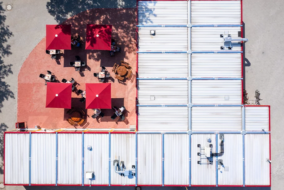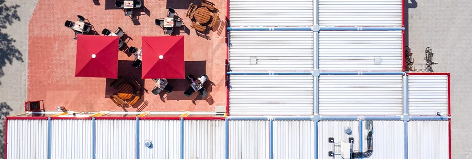 Verantwortlich für die Gebäudeplanung und die gelungene Koordination zwischen dem Bauherrn und dem Containerhersteller ProContain ist die Firma mobilconcept GmbH aus Dresden. Der Container-Dienstleister arbeitet mit ProContain schon seit vielen Jahren erfolgreich zusammen. „In intensiven gemeinsamen Planungsterminen wurden die Wünsche und Anforderungen des Kunden an das Gebäude gesammelt und in den Gebäudeentwurf integriert. ProContain hat als Containerhersteller den Entwurf dann auf die Containerbauweise angepasst“, erläutert Ralf Klopfer, der bei mobilconcept mit Disposition und Verkauf der ProContain-Qualitätscontainer betraut ist. Besonders hervorzuheben sind dabei die Vollverglasung des Gebäudes zur Terrasse hin und die hochwertige technische Ausstattung mit einer komfortablen Lüftungsanlage. Die Rohre sind sichtbar verlegt und sorgen für einen durchaus beabsichtigten, rauen Industriecharme. Als Pendant dazu wurde das Interieur des Cafés sehr wohnlich gestaltet.