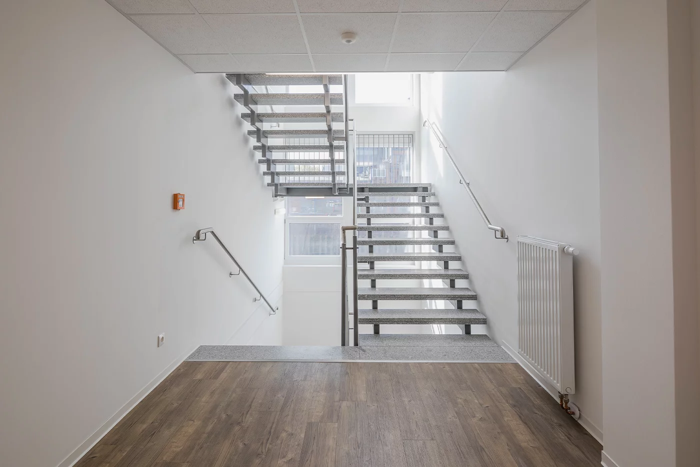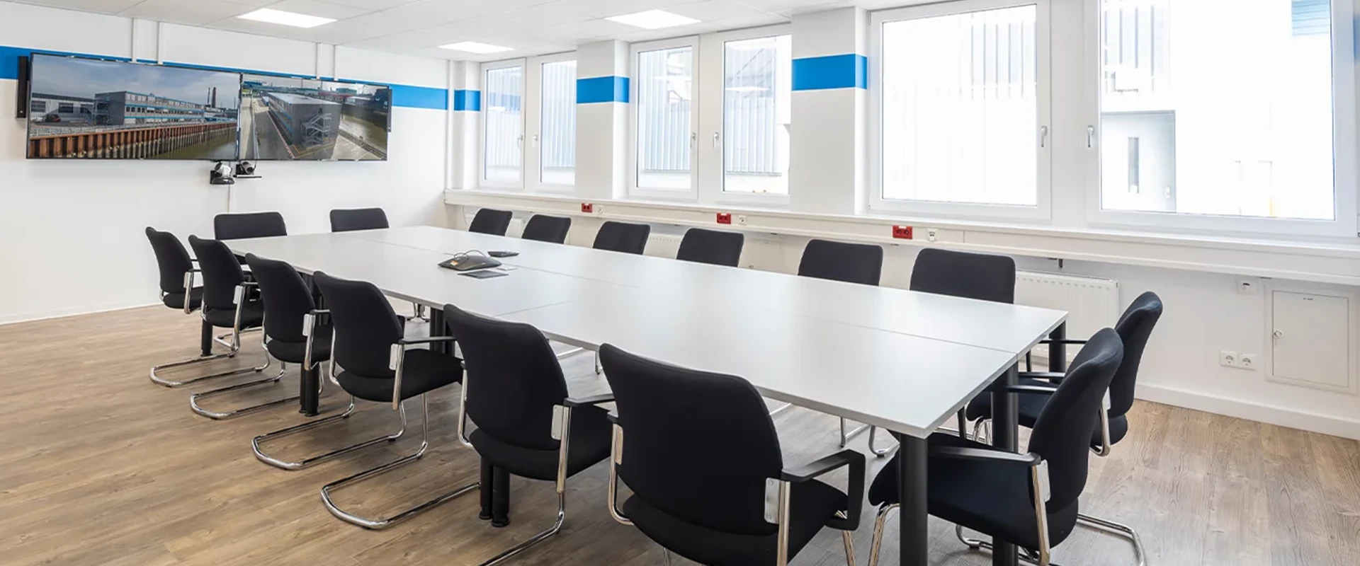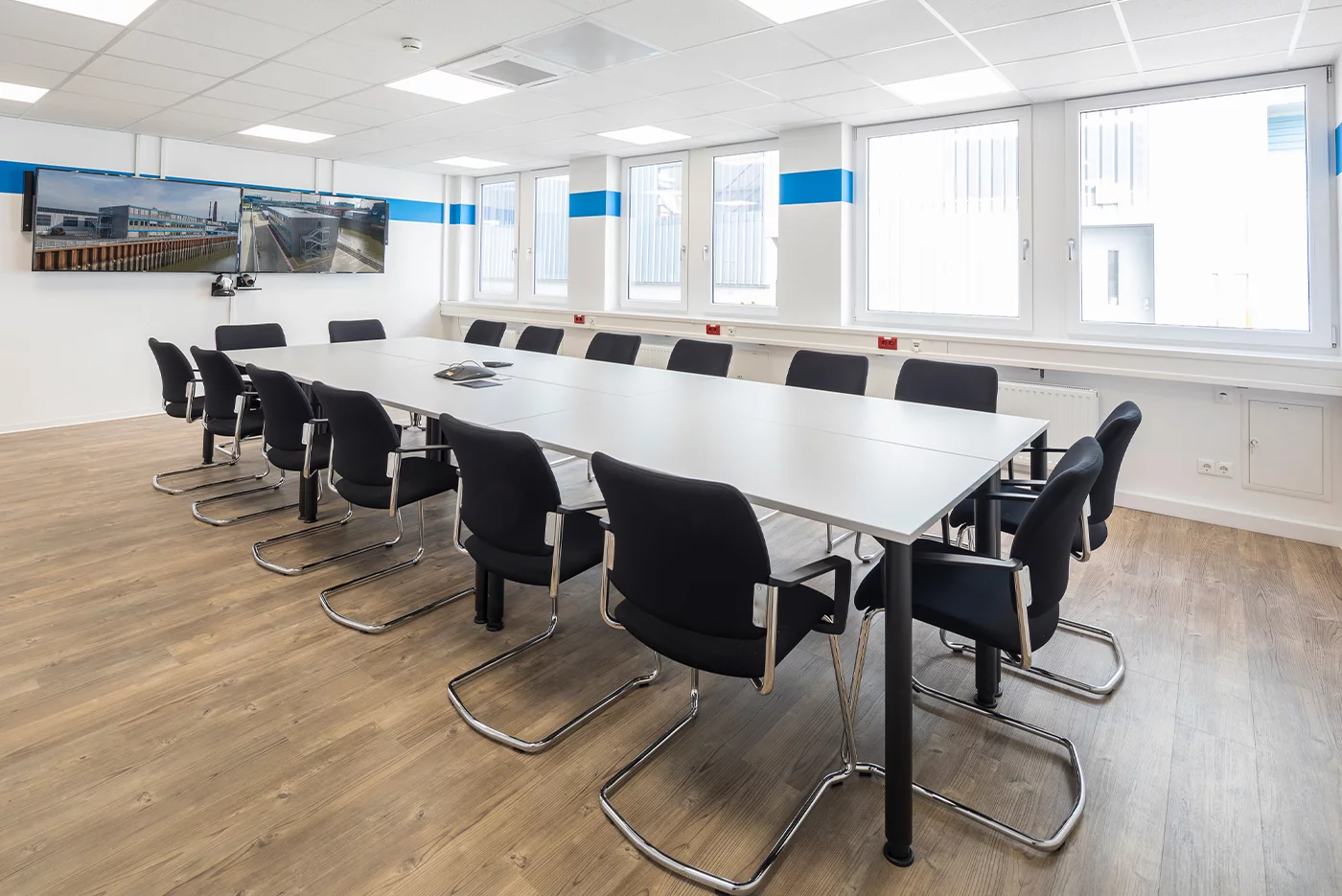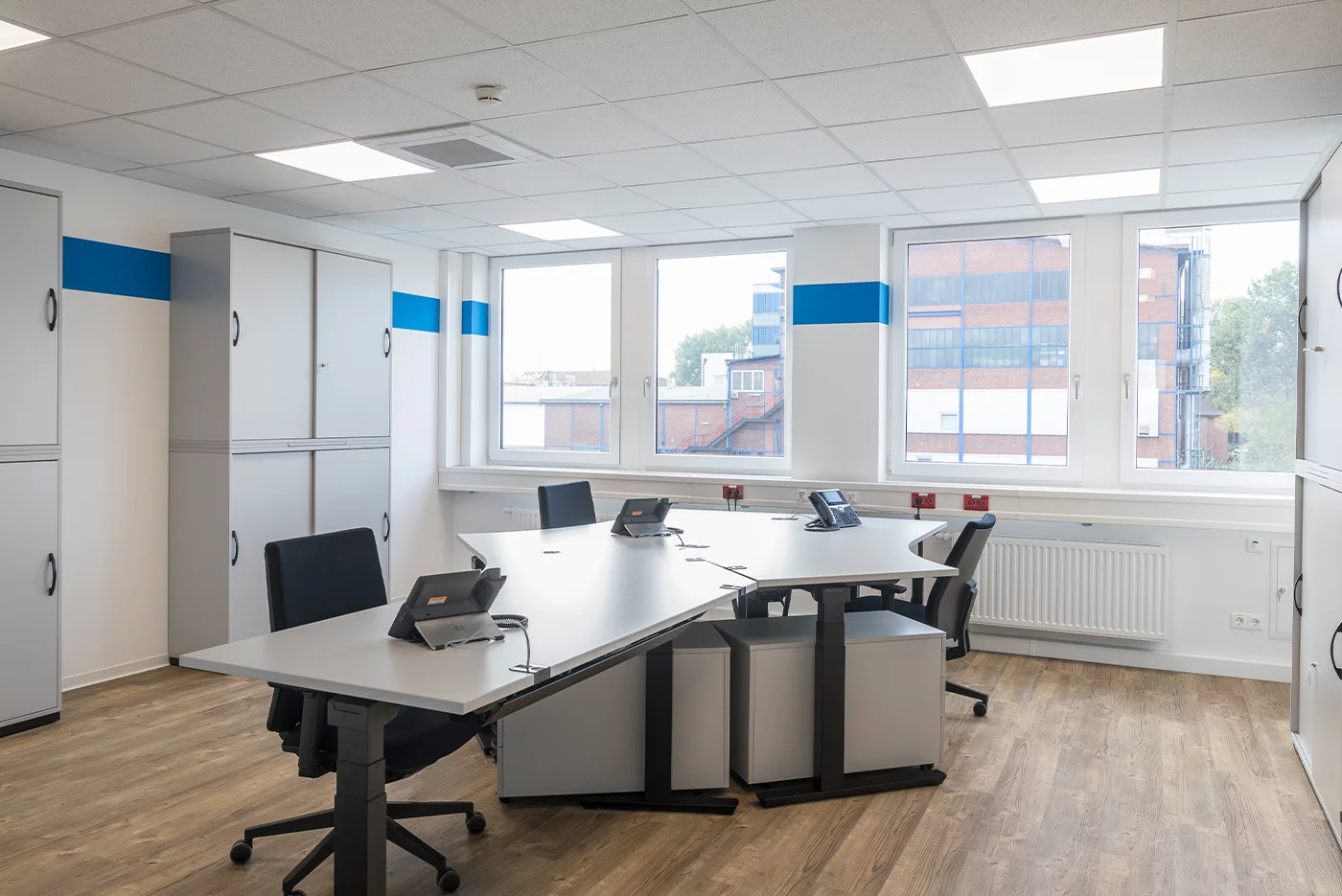 Die hochwertige Ausstattung der neuen Büroanlage lässt keine Wünsche offen: Große Fenster geben den Räumen viel Tageslicht und die in die abgehängte Decke integrierten LED-Leuchten spenden eine optimale Arbeitsplatzbeleuchtung. Als Bodenbelag wählte Aurubis einen hochwertigen Vinylboden in warmer Holzoptik. Die Mitarbeiter sollen sich in der temporären Büroanlage richtig wohl fühlen. Bei der Fassadengestaltung und beim Farbanstrich in den Innenräumen wurden die Unternehmensfarben der Aurubis AG berücksichtigt.