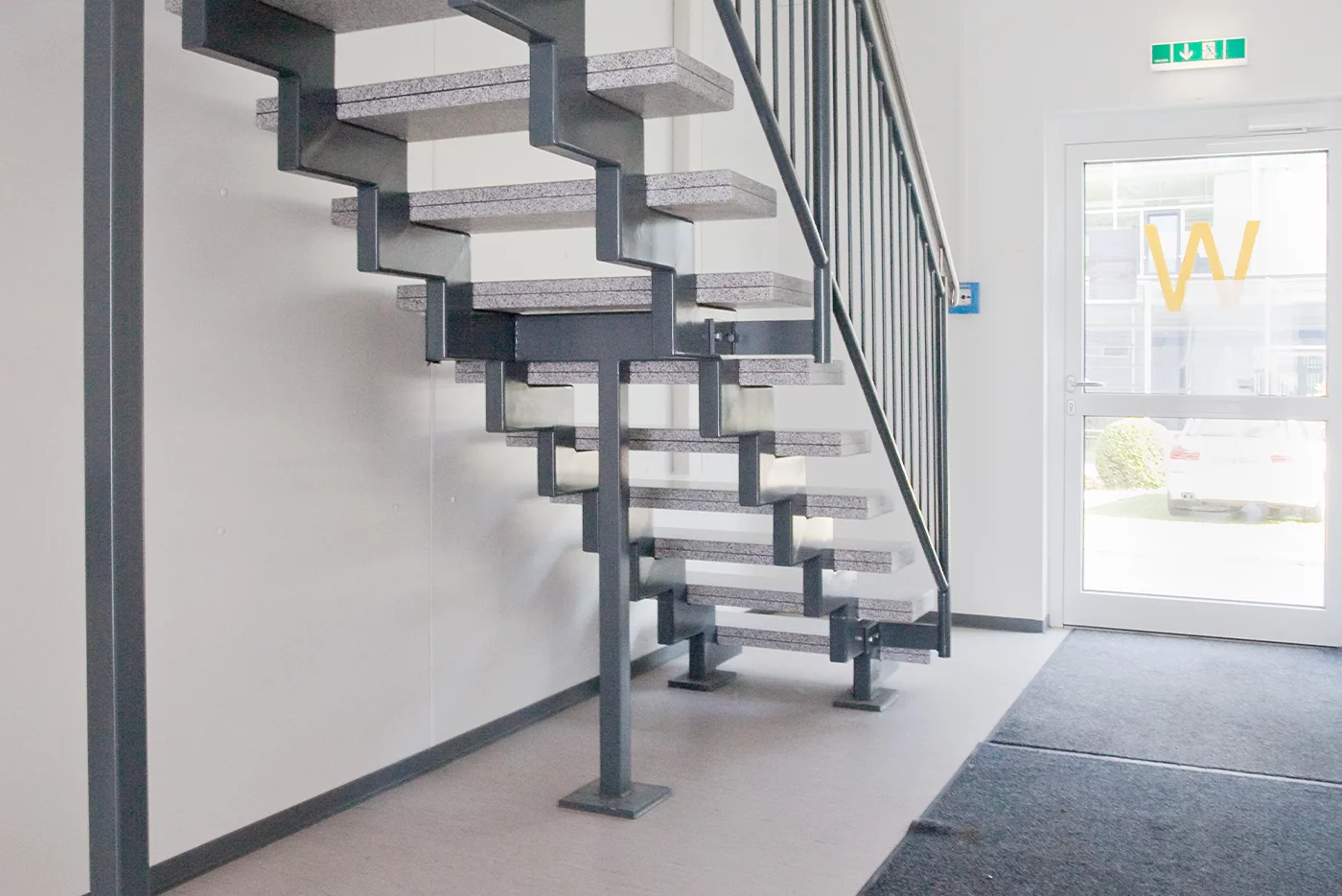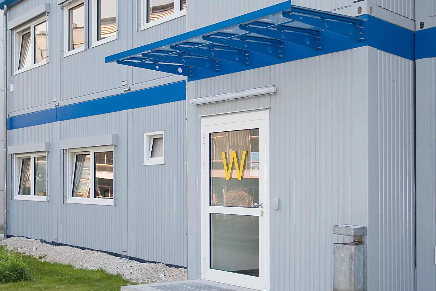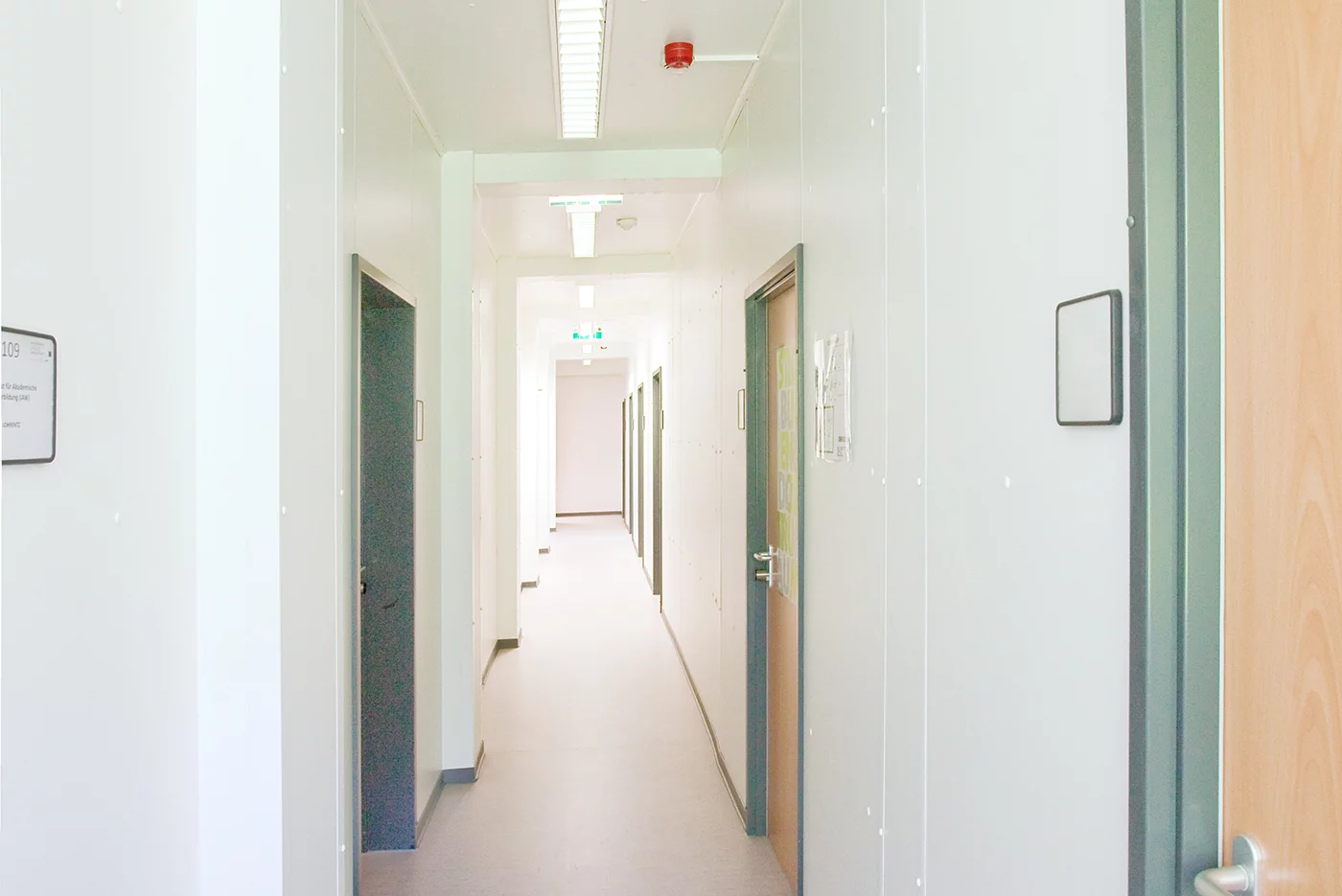 Technische Feinheiten dieser Anlage sind die Abhangdecke mit eingelassenen Spiegelrasterleuchten und das elektronische Schließsystem für alle Außen- und Innentüren. Eine weitere Besonderheit stellt der Eingangs- und Treppenbereich dar. Dieser springt um einen Meter hervor und ermöglicht so – neben einer attraktiven Gestaltung der Frontseite - einen graden Treppenlauf. Die Attika und die Fassadengestaltung in Grau und Blau setzen weitere optische Akzente. Containergebäude können durchaus ansprechend und modern gestaltet sein – das beweisen Container Rent Petri und ProContain mit diesem Projekt.
