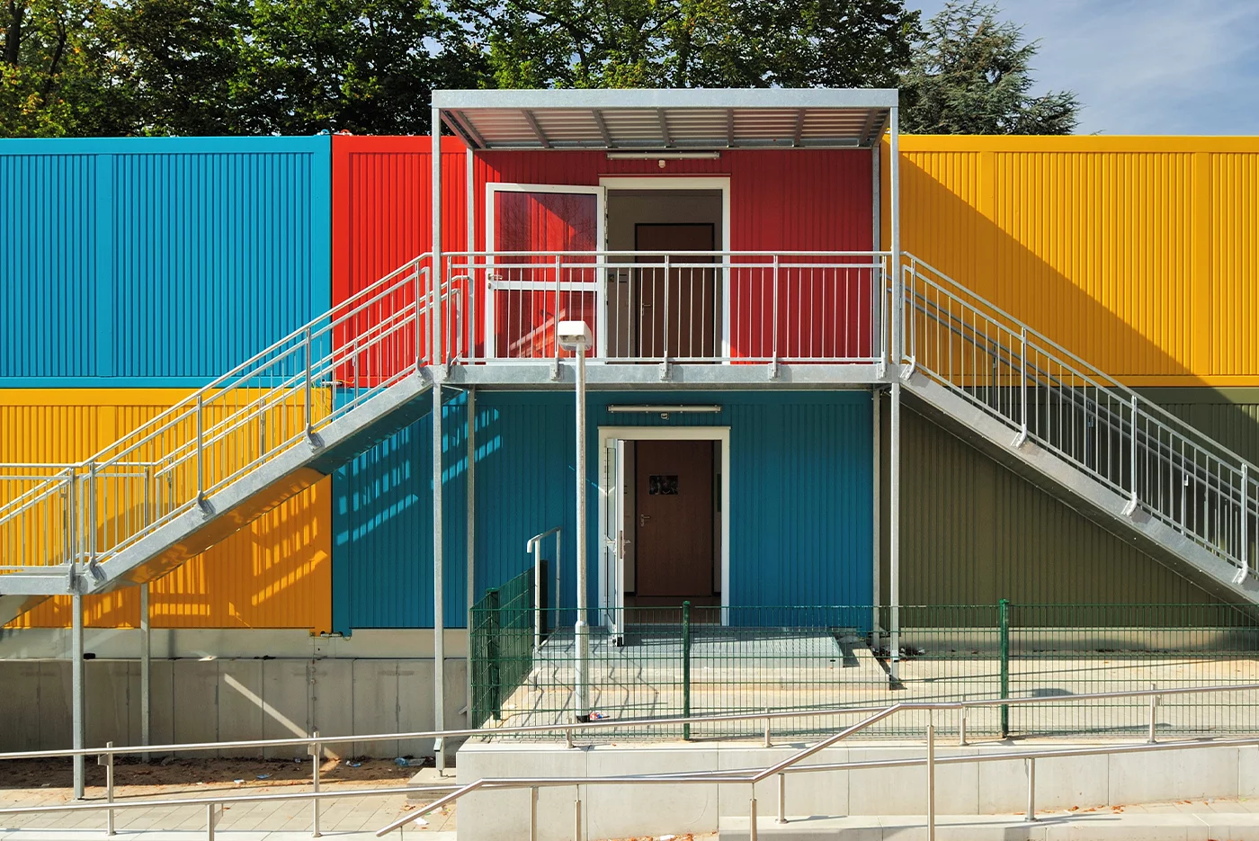 So bunt wie die Schülerschaft präsentiert sich auch die zweigeschossige Schulcontainer-Anlage aus der Produktlinie ProBasic.