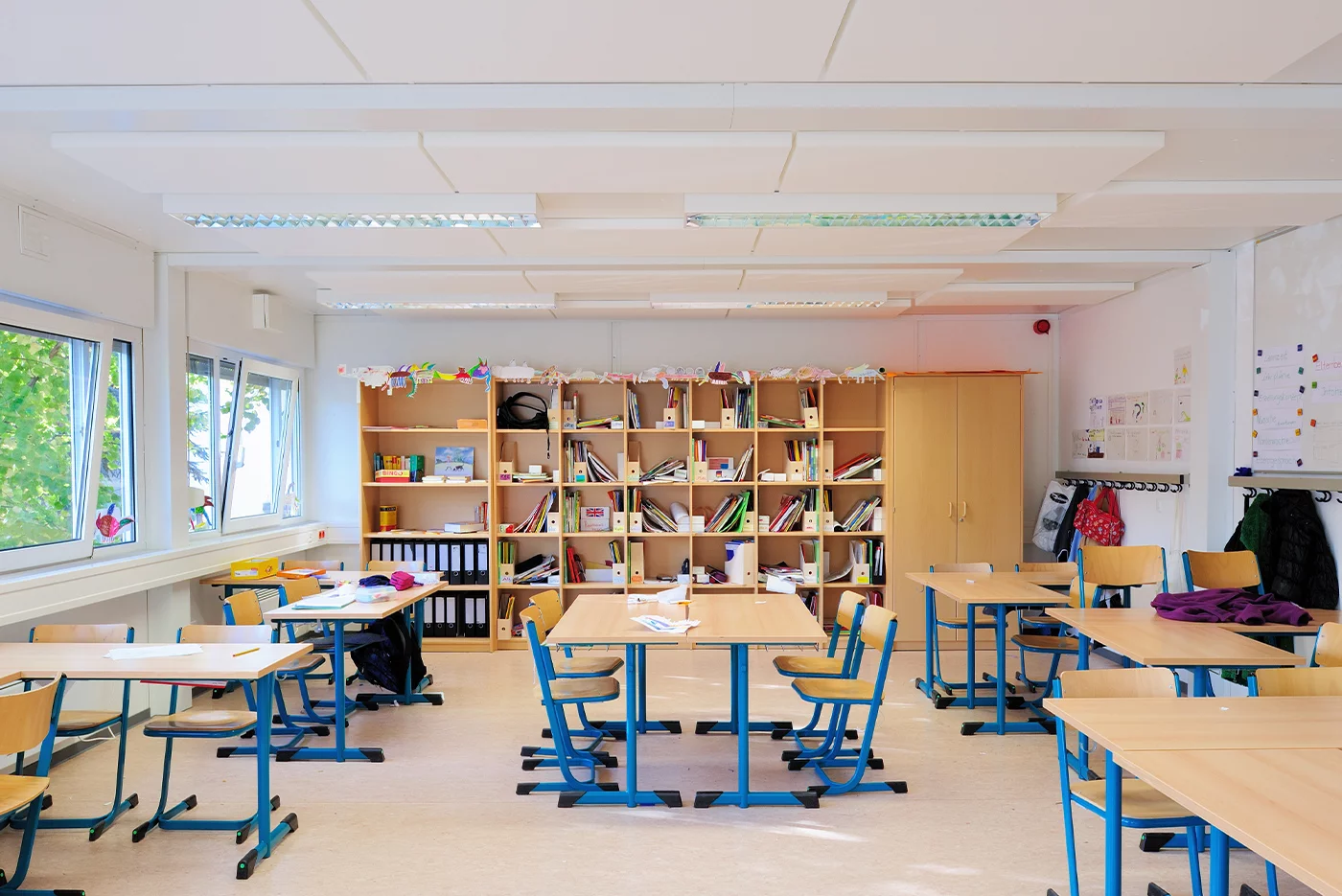 Die IGS-West in Frankfurt ist eine integrierte Gesamt- und Ganztagsschule, in der rund 600 Kinder und Jugendliche mit 59 Nationalitäten unterrichtet werden. So bunt wie die Schülerschaft präsentiert sich auch die zweigeschossige Schulcontaineranlage aus der Produktlinie ProBasic. In verschiedenen fröhlichen Farbtönen lackiert, wirken die Schulcontainer wie aus Legosteinen zusammengesetzt. Im Inneren präsentieren sich die Klassenräume und das Lehrerzimmer lichtdurchflutet, hell und freundlich. Für eine angenehme und ruhige Lernatmosphäre wurden diese Räume mit Akustikplatten ausgestattet. Das obere Stockwerk des 2-geschossigen Gebäudes erreichen die Schüler über eine aufwändige Treppenkonstruktion, die den Schulbaurichtlinien entsprechend mit Zwischenpodesten konstruiert wurde. Die Interimsschule wurde mit kompletter EDV-Installation ausgestattet angeliefert. Für Einbruchssicherheit sorgt eine Alarmierungsanlage, die auf die bestehende Anlage aufgeschaltet wurde.
