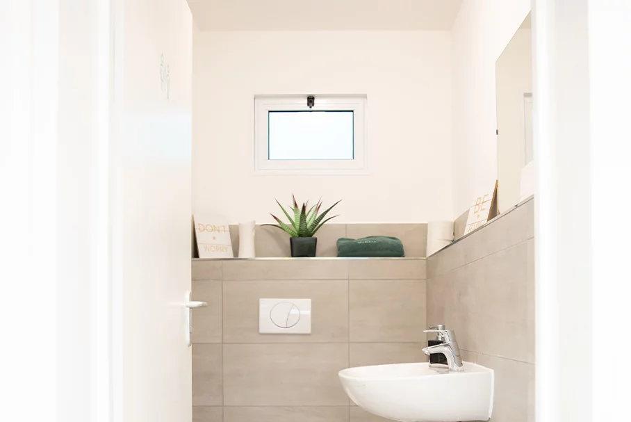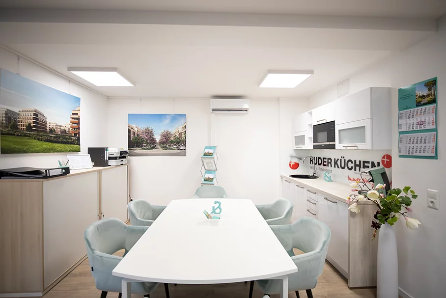 Hinter einer Glasfront schließt sich ein zweiter Raum mit bis zu vier Beratungsplätzen für weitergehende Gespräche an. Das Ambiente im Innern des Showrooms ist bewusst sehr hochwertig und mit Marken-Materialien ausgestattet. Alle Leitungen wurden unter Putz verlegt, auch sind keine Fugen zwischen den einzelnen Stahlelementen sichtbar. Wände und Böden sind sehr wohnlich gestaltet, im gesamten Gebäude sind elektrischer Sonnenschutz und LED-Deckenleuchten eingebaut. Es wird über eine leise Klimaanlage sowohl beheizt als auch gekühlt. Das WC im Erdgeschoss entspricht übrigens 1:1 der Standardausführung der WCs in den späteren Eigentumswohnungen – und hat so die praktische Funktion eines Sanitär-Musterraums direkt vor Ort.