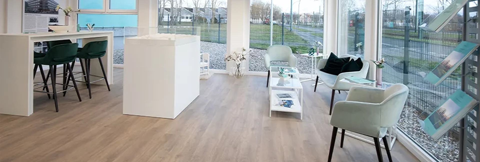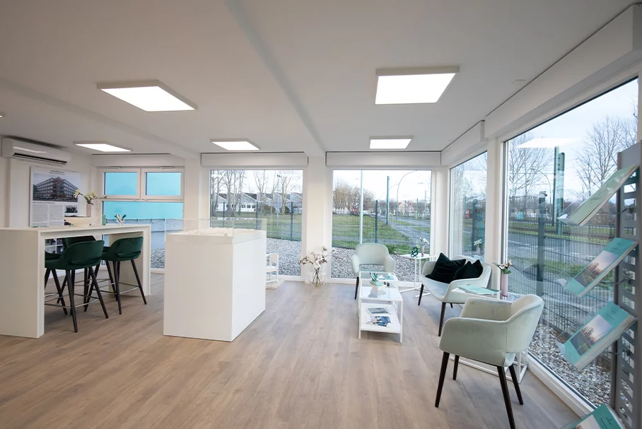Acht Container der Baureihe ProBASIC wurden in nur vier Wochen zu einem 180 qm umfassenden, zweigeschossigen Verkaufsgebäude montiert und mit hochwertigen Markenmaterialien ausgebaut. Im Erdgeschoss gelangen die Besucher über eine überdachte Terrasse in den 40 qm großen Empfangsraum. Bodentiefe Fenster lassen viel Licht herein und machen ihn hell und freundlich.