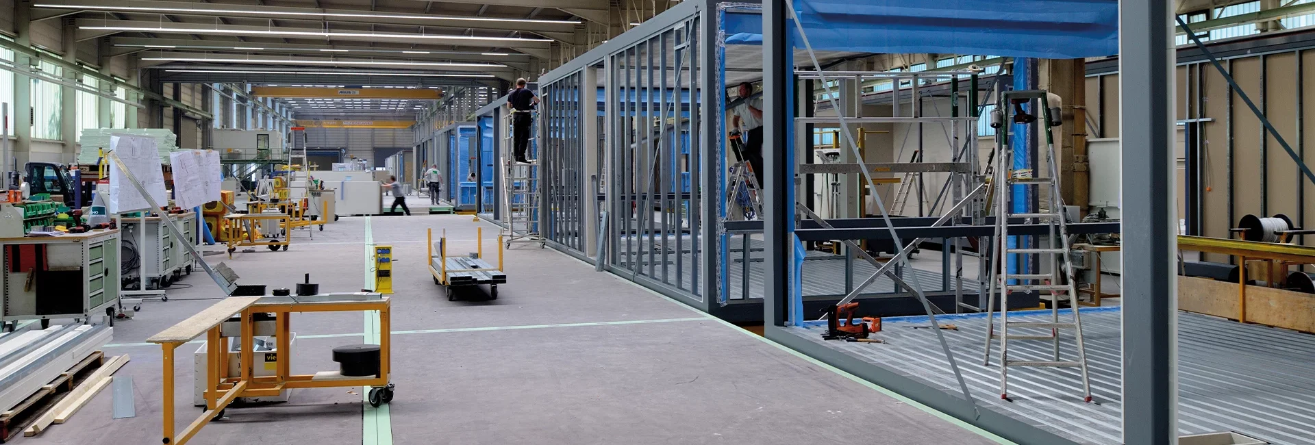 Dans la construction hors-site, les modules sont produits en usine à l’abri des intempéries, c’est pourquoi nous pouvons assurer le respect des délais de livraison pour tous nos projets. La préfabrication en usine se réalise également en temps masqué dans la planification du projet, puisqu’en parallèle, les travaux de préparation de terrain et de fondations sont effectués. Grâce à la construction hors-site, aussi appelée construction sèche, aucune humidité résiduelle du chantier ne peut se former et votre bâtiment peut être utilisé tout de suite. Ces gains de temps considérables à chaque étape de la construction de votre bâtiment vous permettront ainsi d'en disposer beaucoup plus rapidement.