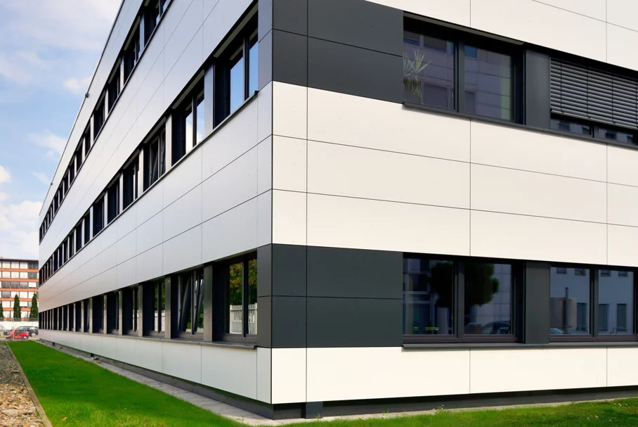 La façade-rideau ventilée et isolée en panneaux HPL blancs confère un look technique et rectiligne au bâtiment. Des fenêtres gris anthracite, encadrées par des éléments de façade blancs et les joints horizontaux sur fond noir de la façade soulignent la forme dynamique du bâtiment. Le bâtiment à toit plat et à trois étages, construit sur un plan de base en forme de U, offre suffisamment de place pour accueillir 160 collaborateurs avec une surface brute d'environ 2900 mètres carrés.
